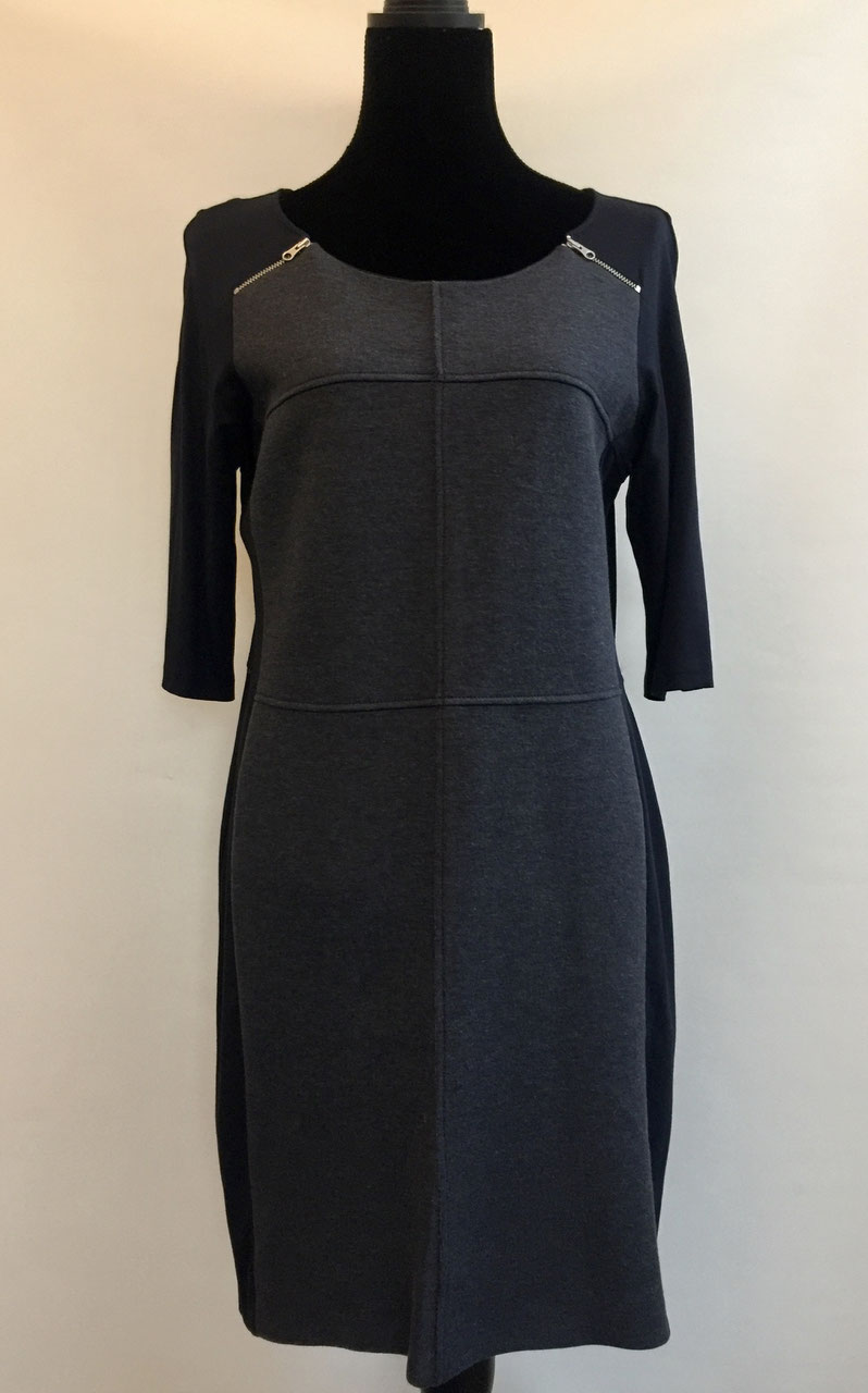 Grijs/donker blauw jurkje. Effen blauw rugpand. Stretch. Als nieuw.
